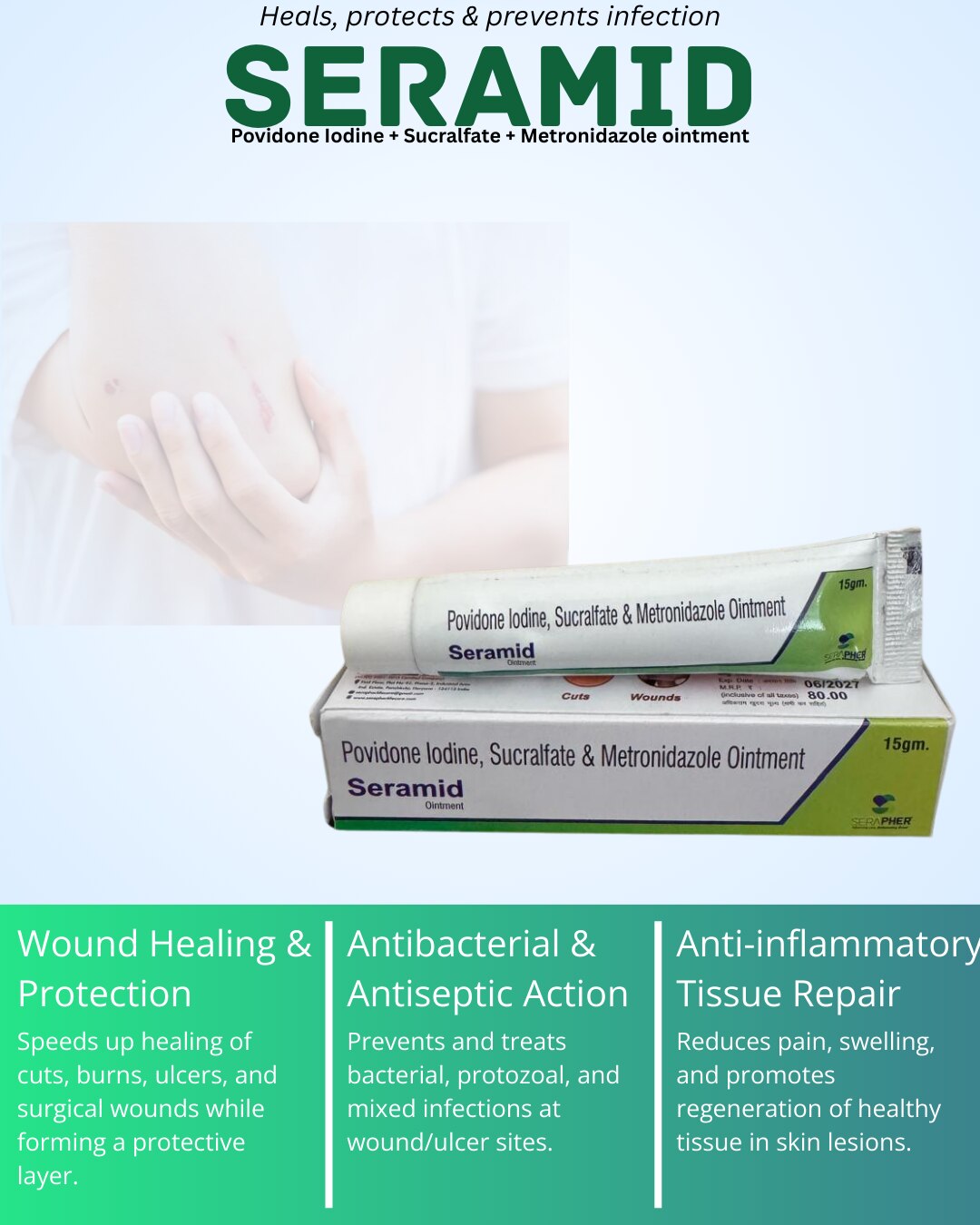 Seramid Ointment is a triple-action topical formulation offering antiseptic, antibacterial, and wound-healing properties. Ideal for infected wounds, ulcers, and burns, it promotes tissue regeneration and prevents secondary infections. Indications: Infected cuts and wounds Pressure sores and bedsores Diabetic foot ulcers Surgical and traumatic wounds Minor burns and abrasions Fungal and bacterial skin infections Benefits: Broad-spectrum antimicrobial action (bacteria, fungi, protozoa) Accelerates wound healing and tissue regeneration Forms a protective barrier over wounds Prevents recurrence of infection Soothes inflamed skin and promotes granulation