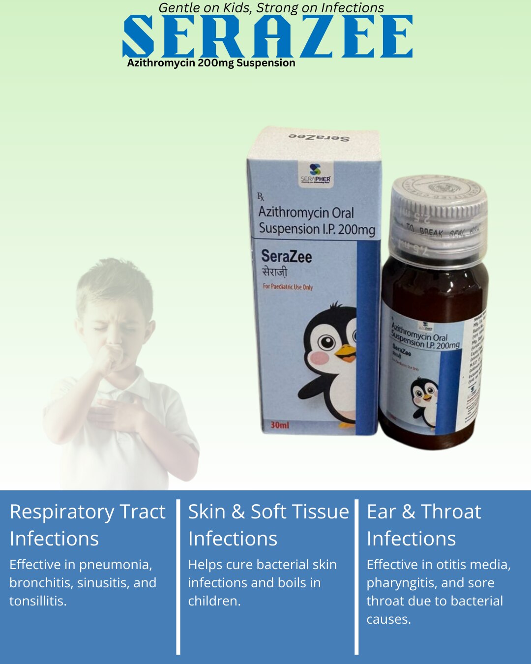 Azithromycin 200mg Syrup is a broad-spectrum macrolide antibiotic specially formulated for pediatric use. It provides effective treatment against a wide range of bacterial infections including those of the respiratory tract, skin, ear, and soft tissues. With its convenient liquid form, it ensures easy administration and better compliance in children. Indications: Upper Respiratory Tract Infections (Pharyngitis, Tonsillitis, Sinusitis) Lower Respiratory Tract Infections (Bronchitis, Pneumonia) Otitis Media (Ear Infections) Skin & Soft Tissue Infections Typhoid Fever (Pediatric use) Community-acquired Pneumonia Pediatric bacterial infections sensitive to Azithromycin Key Benefits: Broad-Spectrum Activity: Effective against Gram-positive, Gram-negative & atypical bacteria. Pediatric Friendly: Syrup form ensures easy swallowing & accurate dosing for children. Once Daily Dose: Improves child compliance & convenience. Well-Tolerated: Fewer gastrointestinal side effects compared to other antibiotics. Fast Action: Quickly reduces fever, cough & infection symptoms. Shorter treatment duration compared to conventional antibiotics.
